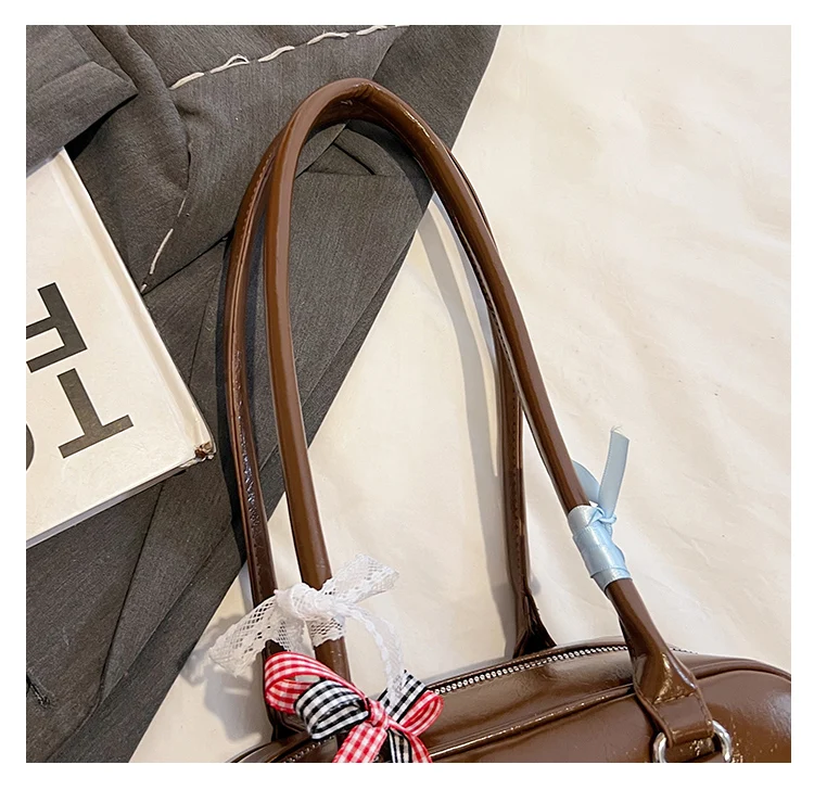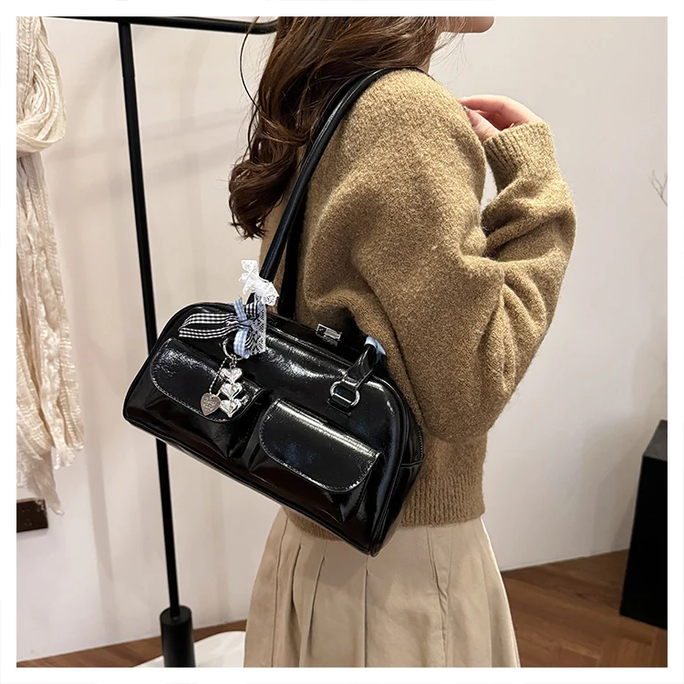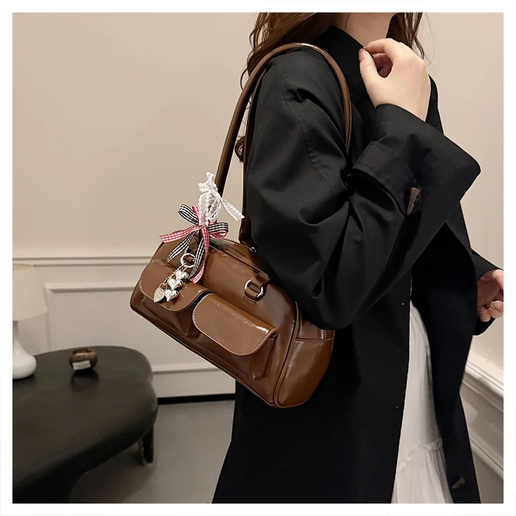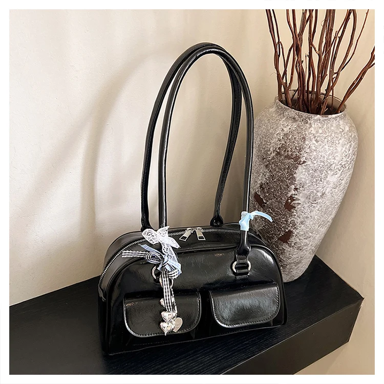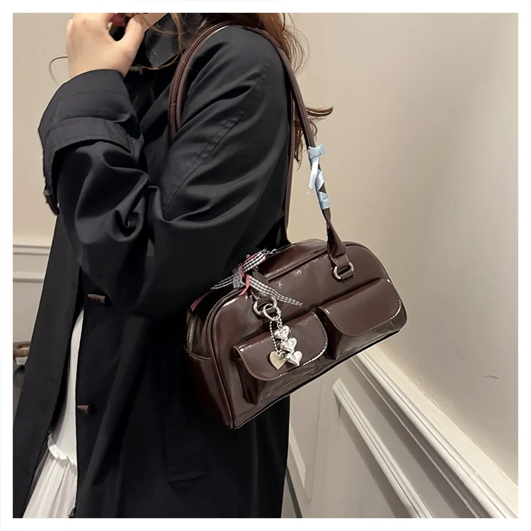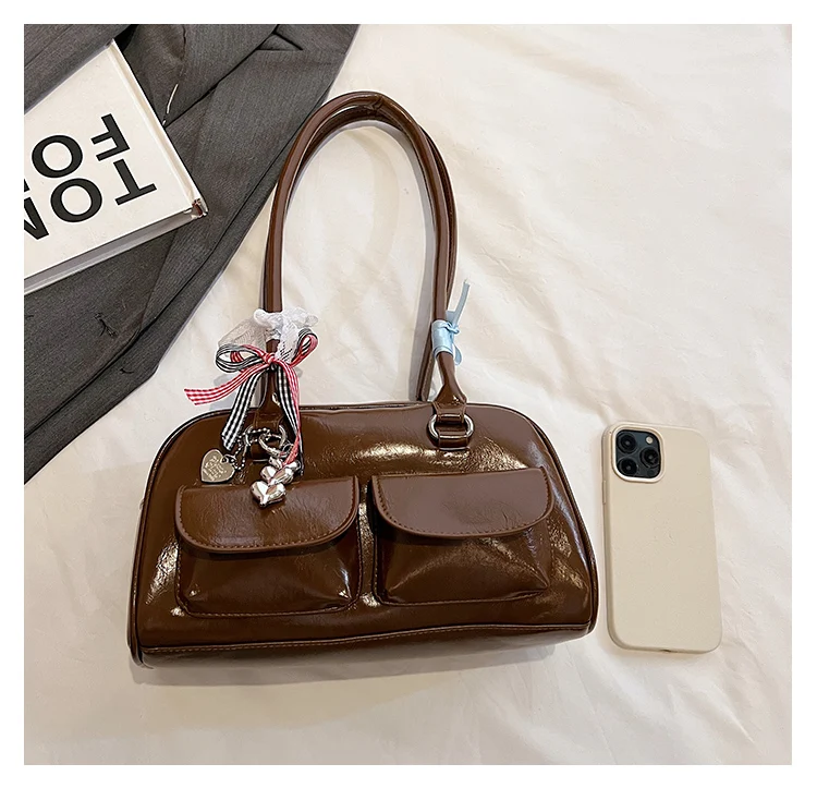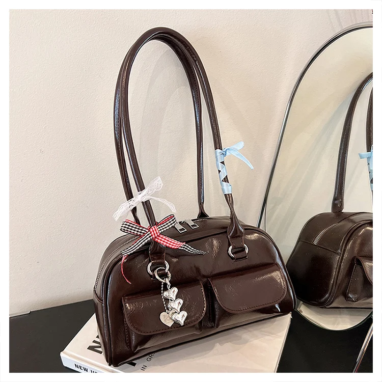 ♥Style:2025 New Boston Bags For Women Retro Leather Bowling Bags With Front Pockets Armpit Shoulder Bag Commuting Totes Ladies Handbags